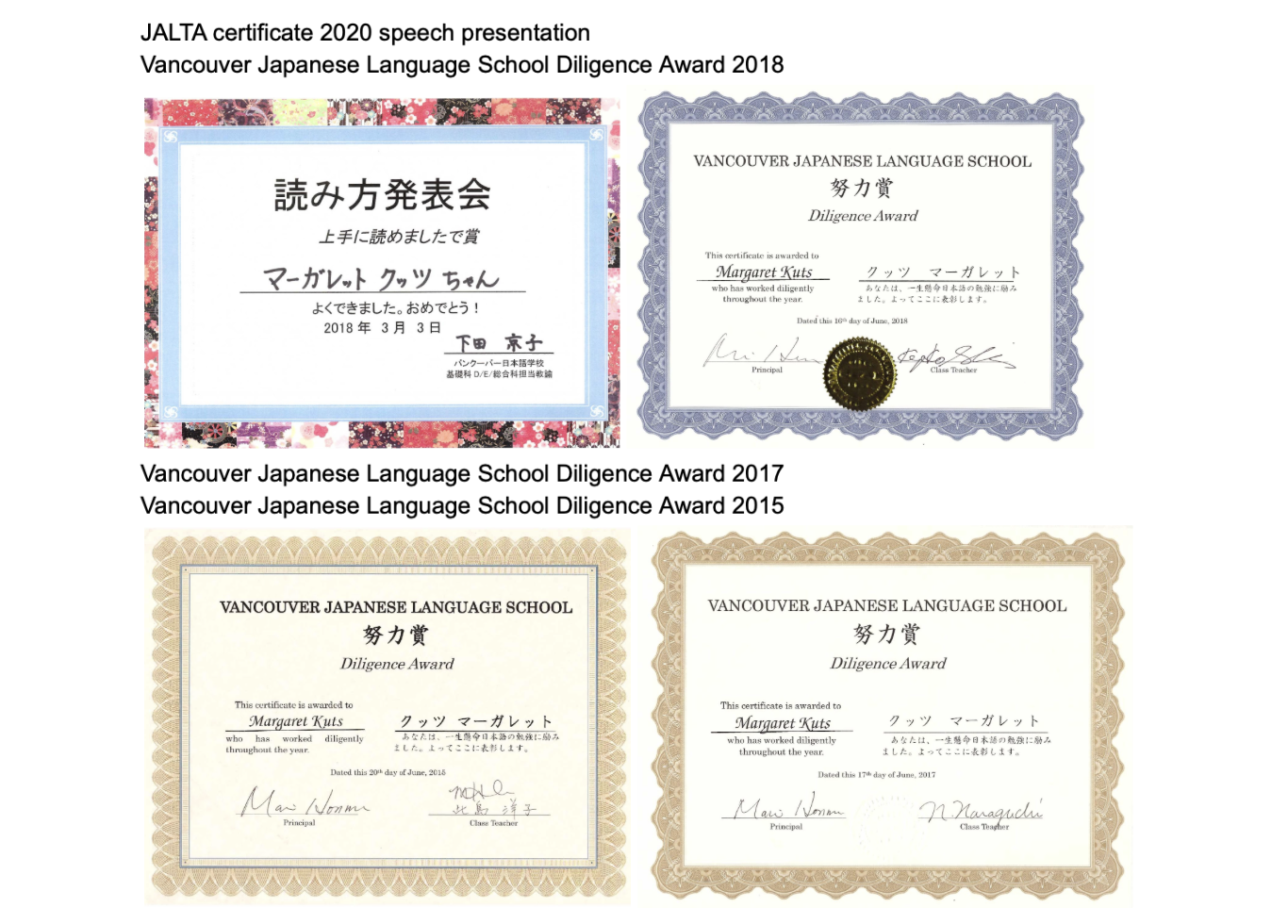 Throughout my time at VJLS-JH, I received the Diligence Award multiple times (2015-2018), which was particularly meaningful to me since no one at home could help with my homework or test preparation. Every kanji I memorized, every grammar pattern I mastered, every vocabulary list I learned was the result of independent study and determination.